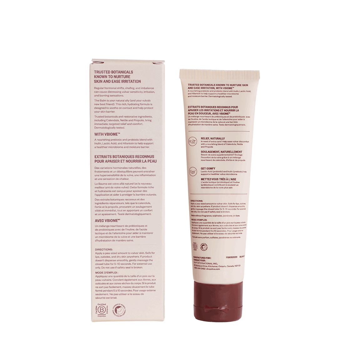 L’Hydratant DIVA est un hydratant quotidien léger conçu pour maintenir la vulve confortable et nourrie. Le Baume a une texture plus riche et plus protectrice et est destiné aux moments où la sécheresse est plus intense et où un soutien apaisant supplémentaire est nécessaire en cas d'inconfort vulvaire.